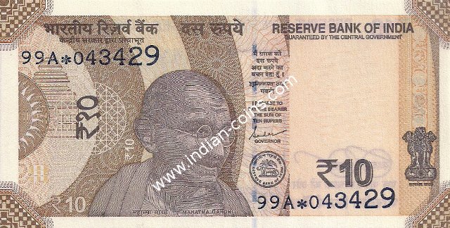 * DENOMINATION - 10 in three places & PORTRAIT - M K Gandhi * SIZE - 137 X 63 mm & SERIAL NUMBER - in two places * COLOR -Orange, purple andmulticolor * LEGEND - Value rupees in Hindi and English |