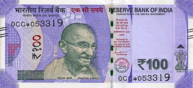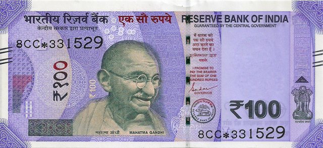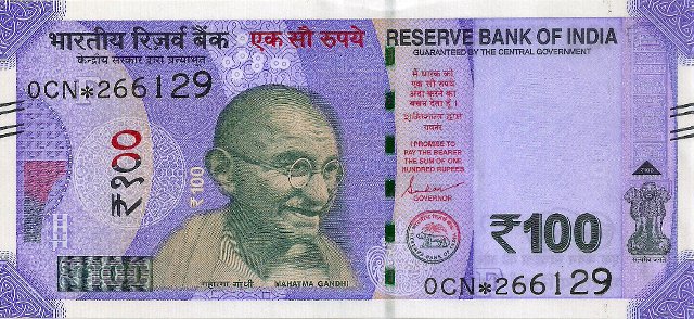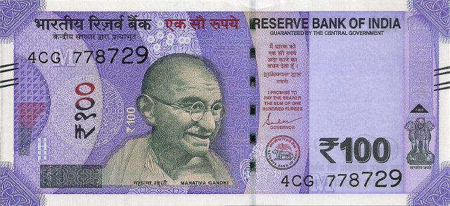 OBVERSE:- * Portrait of M K Gandhi & SERIAL NUMBER - in two places * SIZE -147 X 33 mm & Wide security thread with RBI *DENOMINATION - 100 in three places * LEGEND - Value rupees in Hindiat center