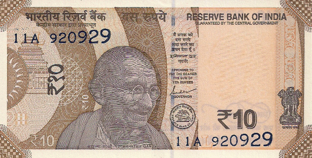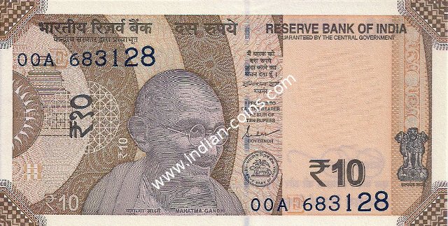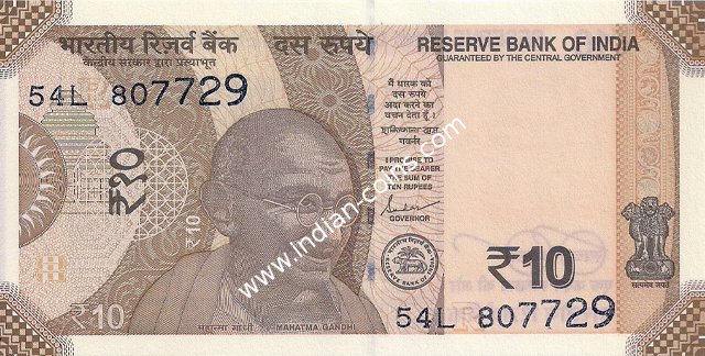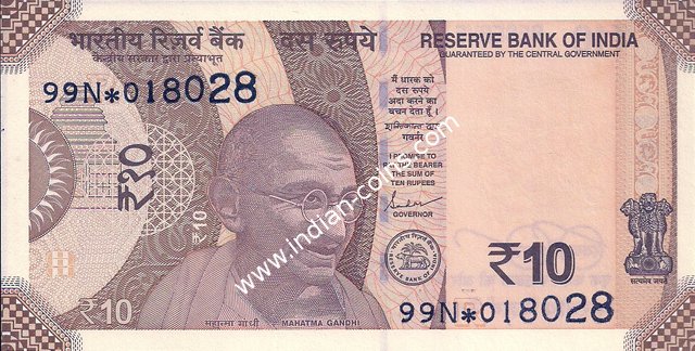 * DENOMINATION - 10 in three places & PORTRAIT - M K Gandhi * SIZE - 137 X 63 mm & SERIAL NUMBER - in two places * COLOR -Orange, purple andmulticolor * LEGEND - Value rupees in Hindi and English |