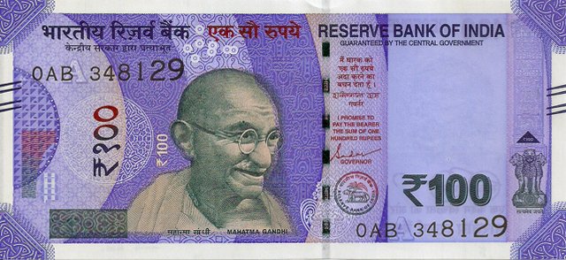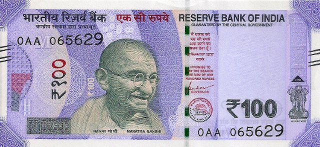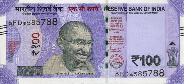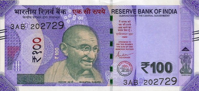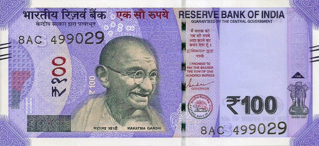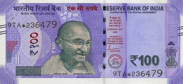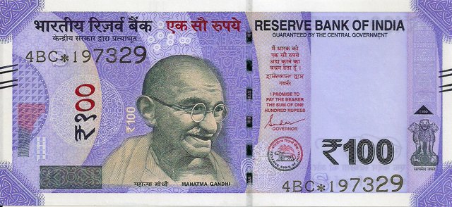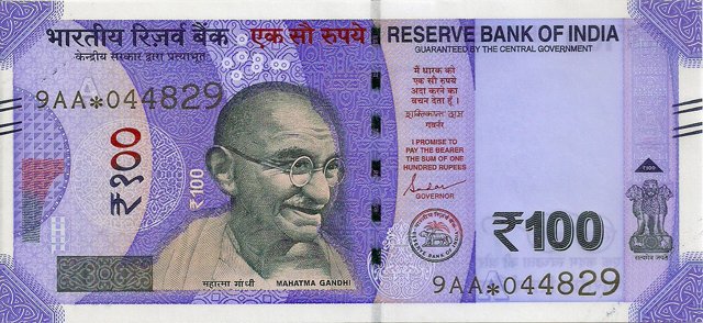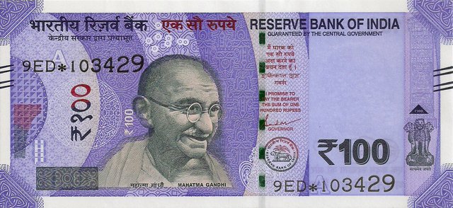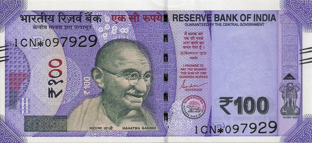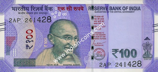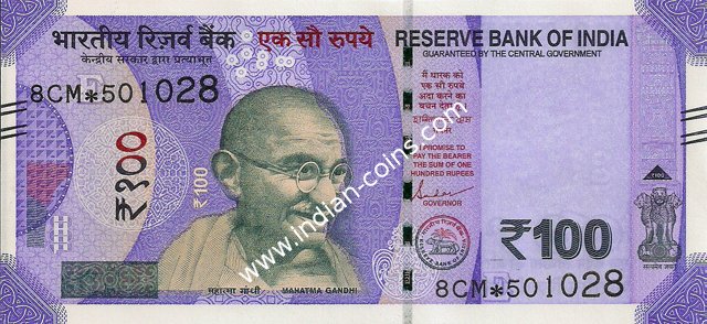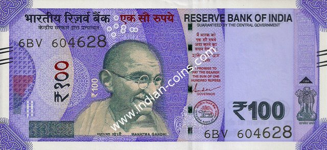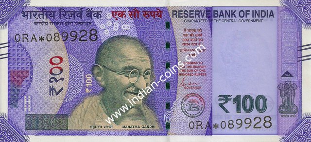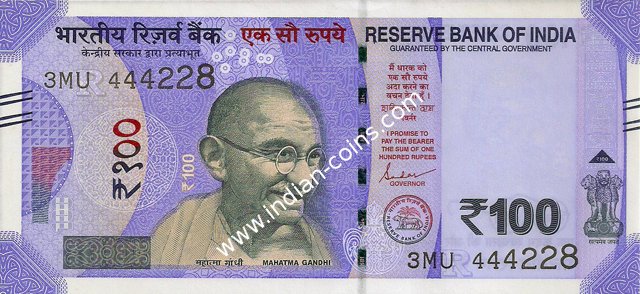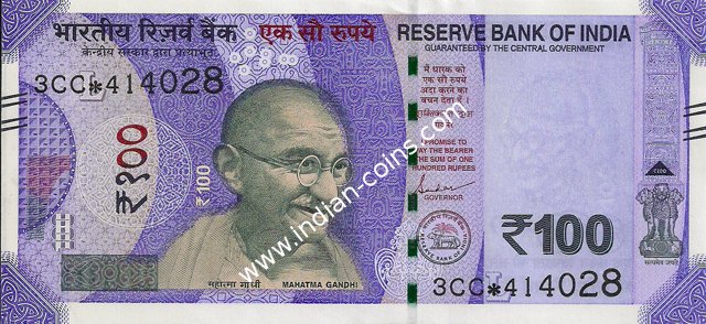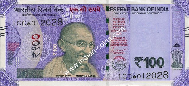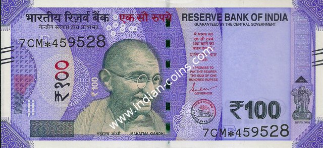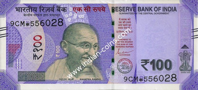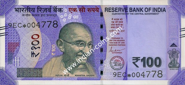 OBVERSE:- * Portrait of M K Gandhi & SERIAL NUMBER - in two places * SIZE -147 X 33 mm & Wide security thread with RBI *DENOMINATION - 100 in three places * LEGEND - Value rupees in Hindiat center